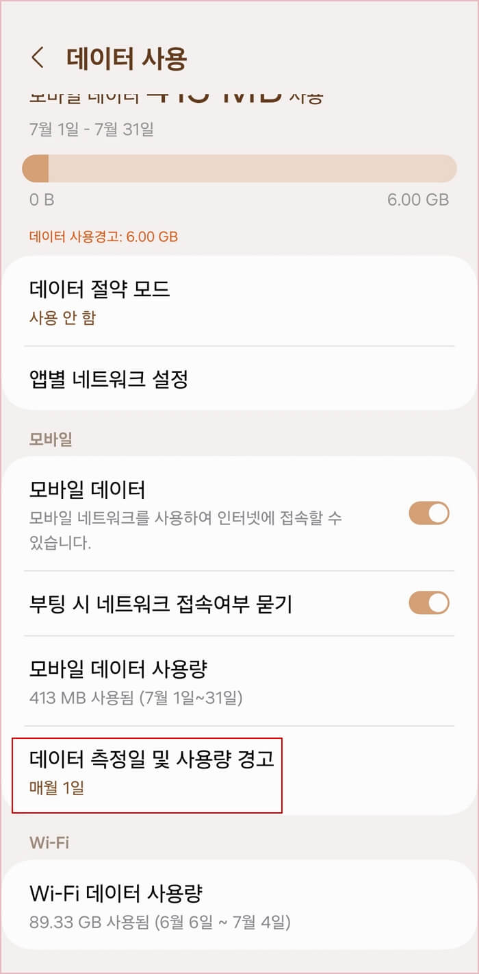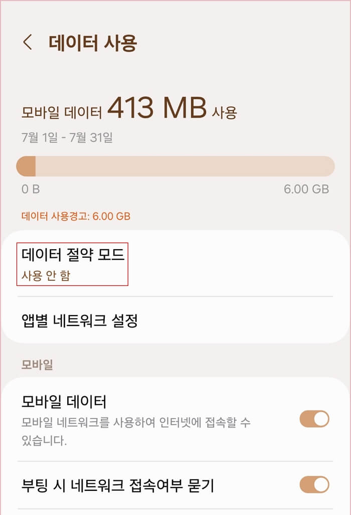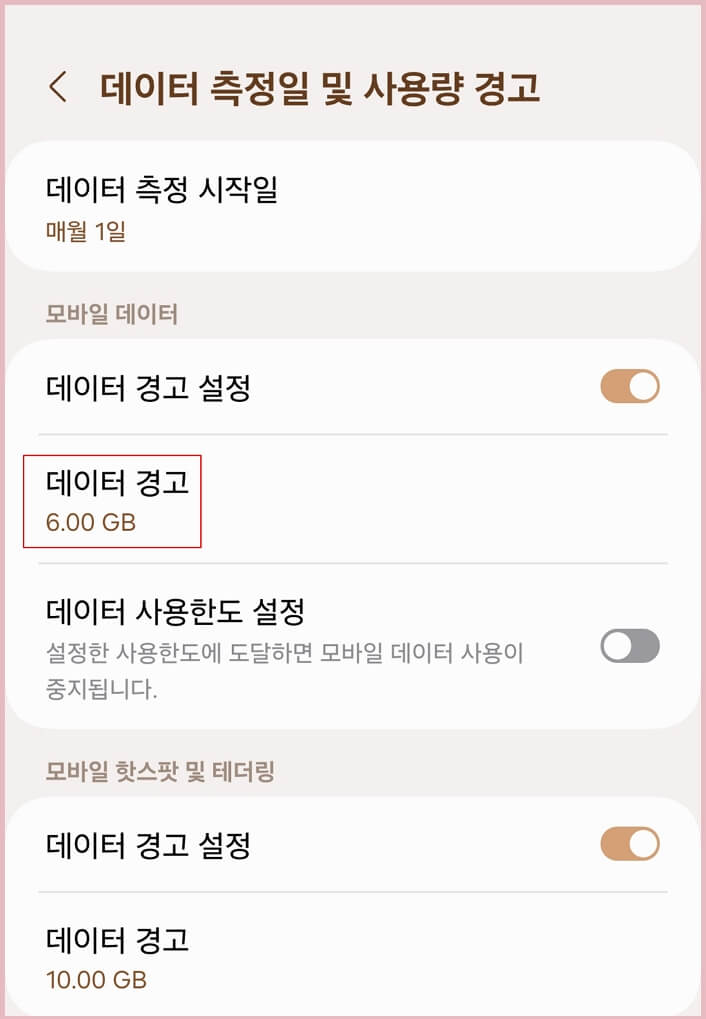 1. 모바일 데이터에서 '데이터 경고' 활성화