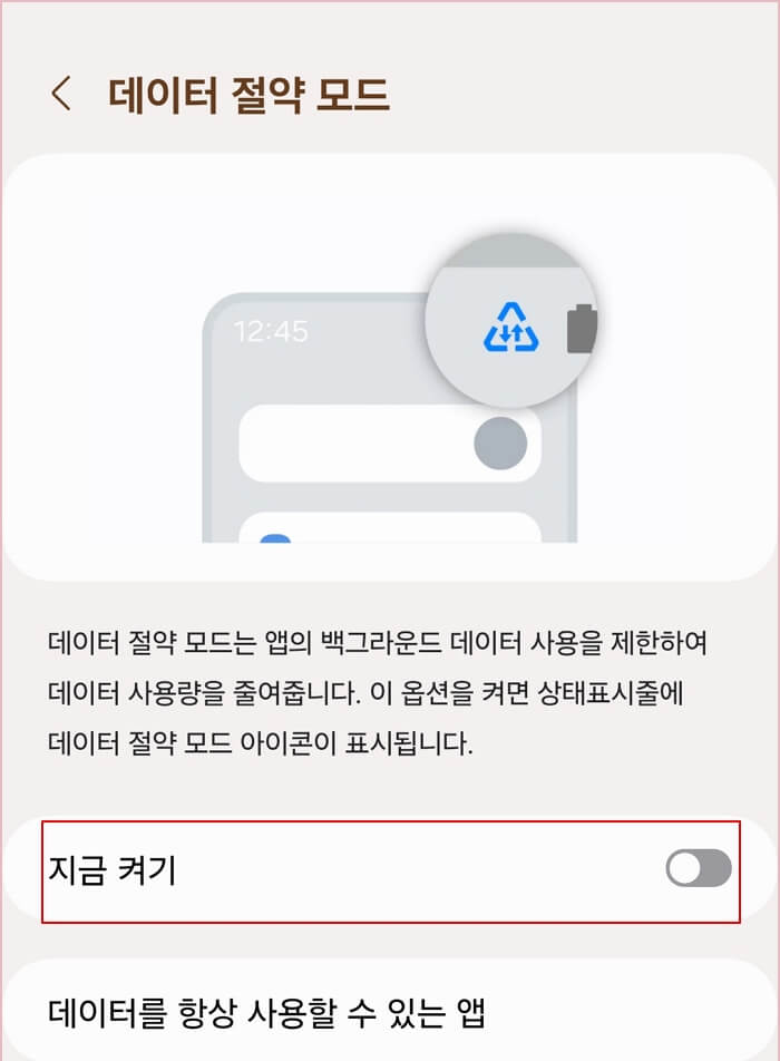 '지금 켜기' 버튼을 눌러서 데이터 절약 모드를 활성화하면 앱들이 백그라운드에서 데이터를 사용하는 것을 제한해줘요. 하지만 꼭 필요한 앱들은 '데이터를 항상 사용할 수 있는 앱' 목록에 추가해서 정상적으로 사용할 수 있도록 설정할 수 있습니다.