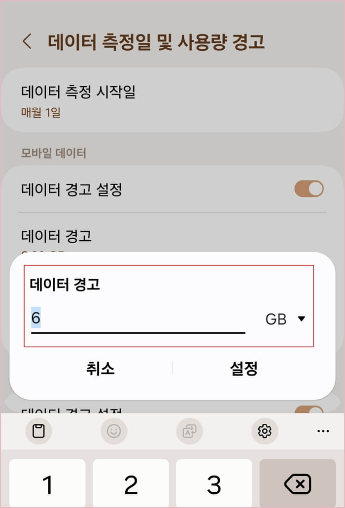 2. 경고받을 데이터 사용량 설정