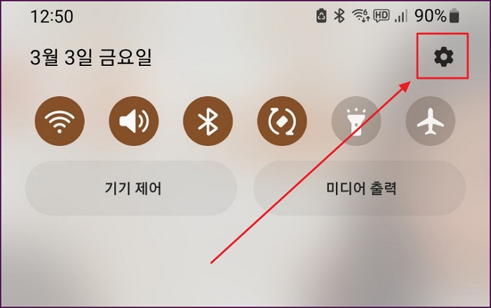갤럭시 핸드폰의 위치 추적방법은 간단합니다. 먼저, 핸드폰 상단을 내려줍니다. 그리고 우측 상단에 톱니바퀴를 눌러주세요.