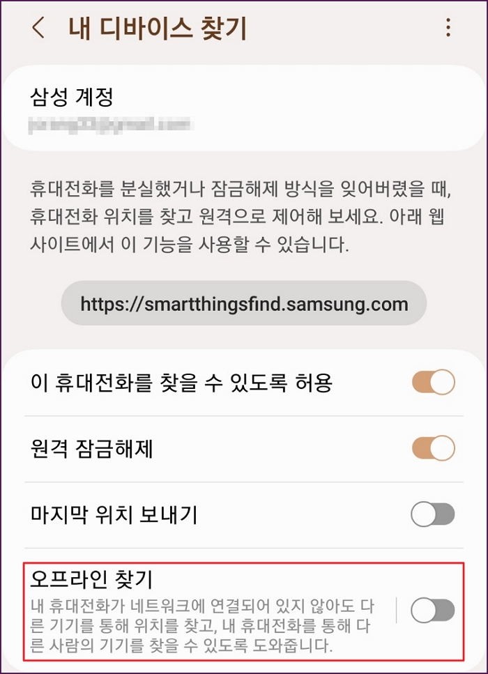 오프라인 찾기를 눌러서 ON 상태로 바꿔줍니다.