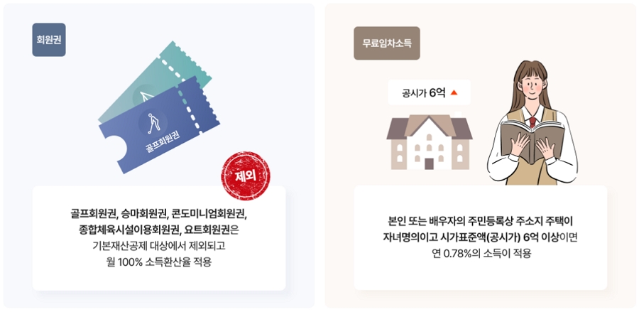 골프회원권, 승마회원권, 콘도미니엄회원권, 종합체육시설이용회원권, 요트회원권은 기본재산공제 대상에서 제외되고 월 100퍼센트 소득환산율을 적용합니다. 본인 또는 배우의 주민등록상 주소지 주택이 자녀 명의이고 시가표준액(공시가) 6억 이상이면 연 0.78퍼센트 소득이 적용됩니다.