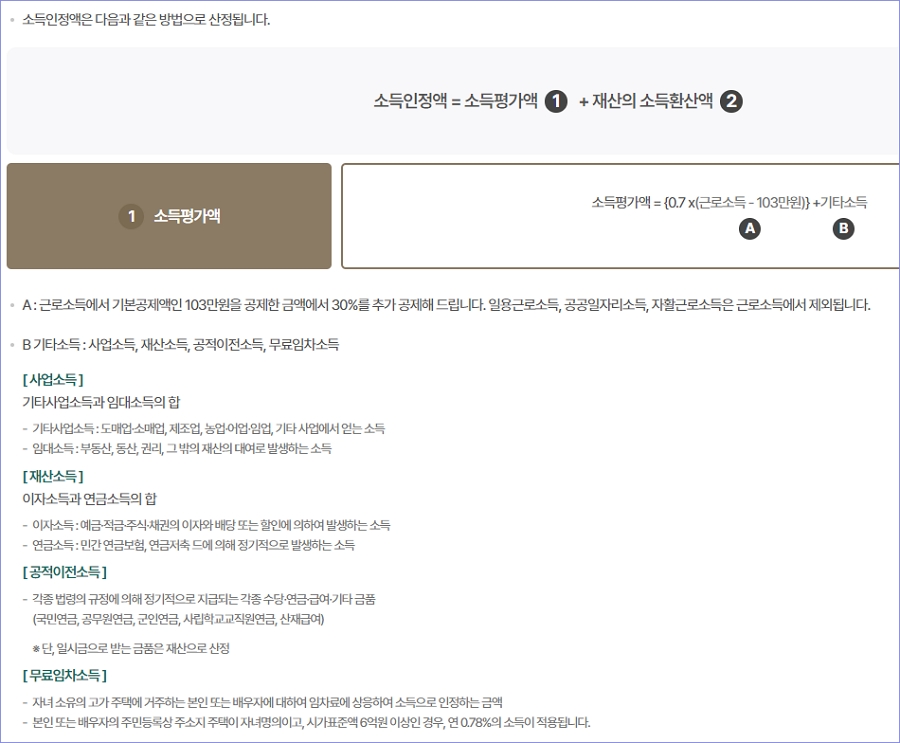 (1) 소득 평가액의 계산방법은 "소득평가액={0.7x(근로소득-103만원 A)} +기타소득 B 로 계산합니다.
