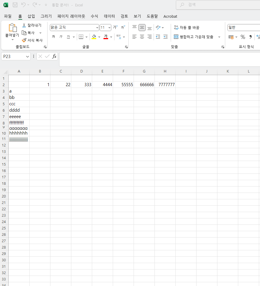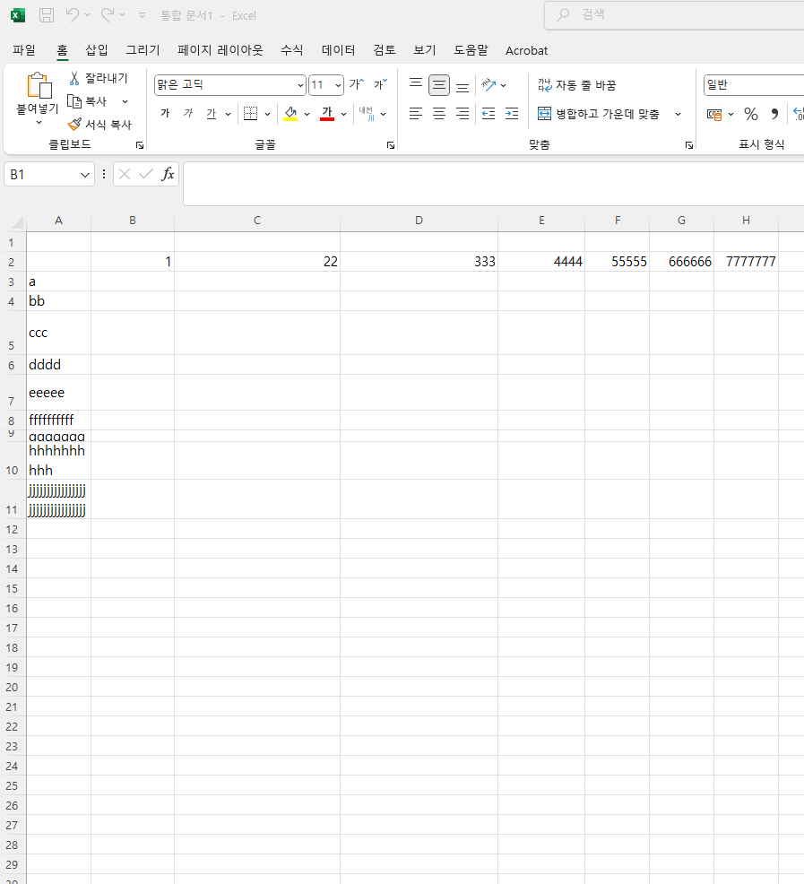 행의 크기 변경도 똑같습니다. 행과 행사이 그러니까 1과 2, 2, 3 사이에 마우스를 가져다 댑니다. 그리고 더블 클랙해주세요. 그러면 행의 크기가 자동으로 텍스트에 맞춰서 변경이 됩니다.