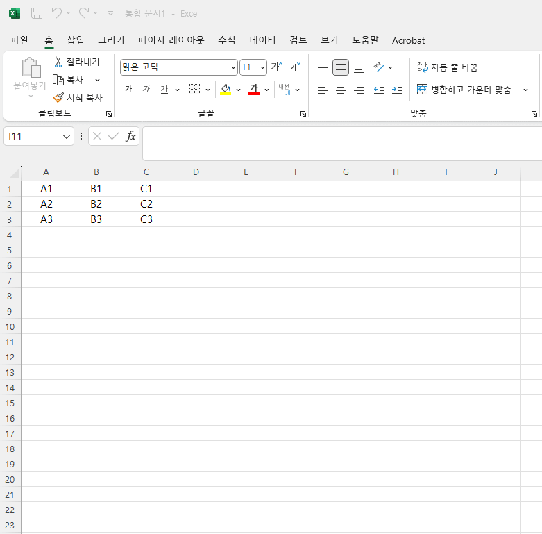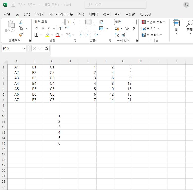막간에 기능 한가지 더 알고 가겠습니다. 빈셀을 누른채 아래로 드래그 합니다. 6개의 셀을 중복 선택하였고요. 그대로 1을 눌러서 첫번째 셀에 입력되도록 해줍니다. 그리고 컨트롤 + 엔터키를 누르면 자동으로 1이 선택한 셀에 전부 입력됩니다.