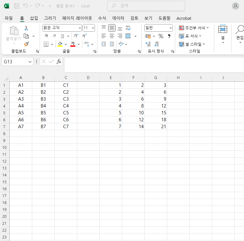 이번에는 연속 숫자 채우기를 숫자만으로 진행해 보았습니다. 123을 입력하고 우측 모서리를 누른채 아래로 드래그 하면 4567까지 자동으로 채우기가 됩니다. 그리고, 246은 2배수씩 8 10 12 14까지 자동으로 입력됩니다. 369는 3배수씩 12 15 18 21까지 자동으로 입력됩니다.