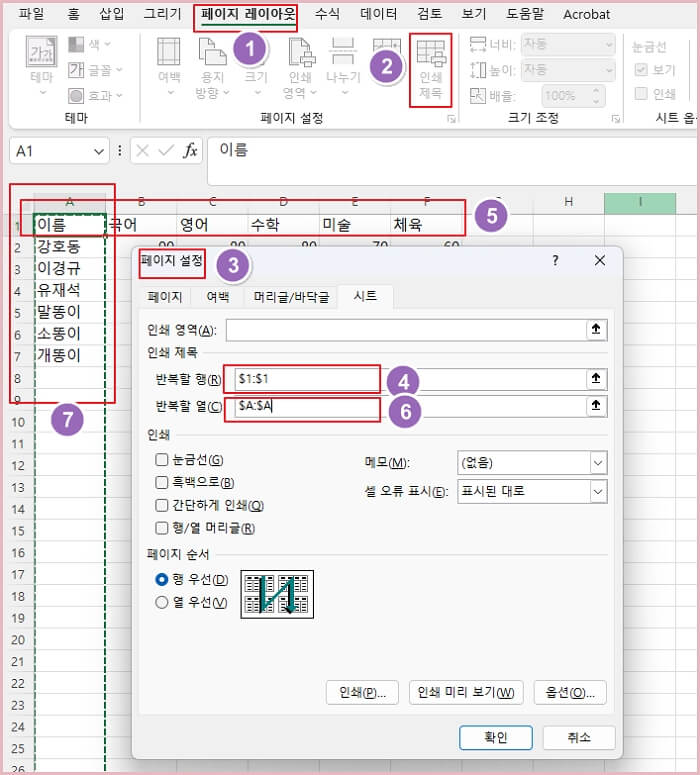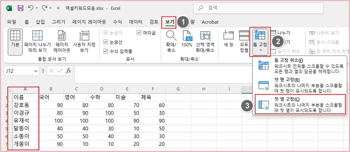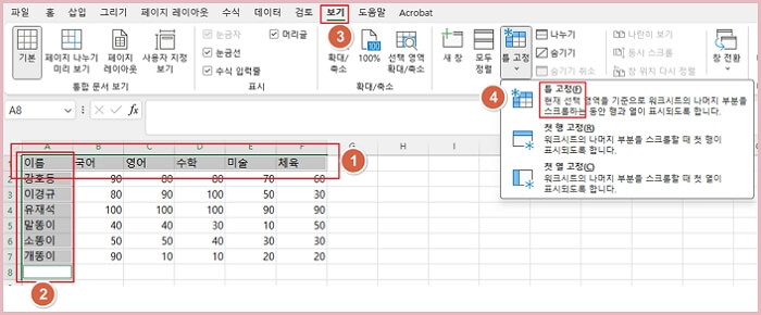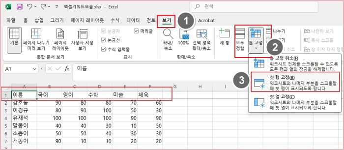 이번에는 이름, 국어, 영어등이 입력된 첫 행을 고정해 보도록 하겠습니다.