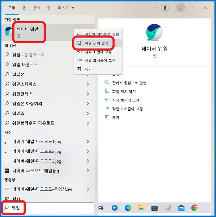 크롬과 마찬가지로 좌측하단에 웨일을 검색합니다. 그리고 네이버 웨일에 마우스 우클릭하시고 파일 위치 열기를 눌러줍니다.