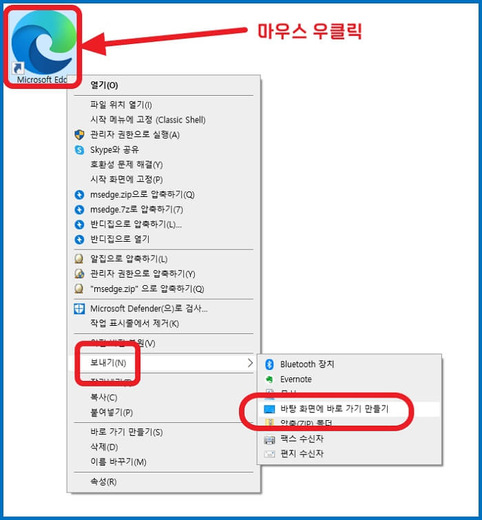 엣지 아이콘 위에서 마우스 우클릭해줍니다. 보내기, 바탕 화면에 바로 가기 만들기를 순서대로 눌러주면 됩니다. 그리고 바탕화면에 아이콘이 잘 나와있는지 확인해줍니다.