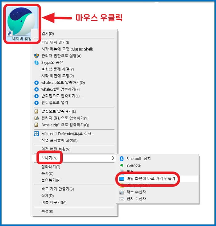 바탕화면에 웨일 바로가기 아이콘을 추가하는 방법입니다.
