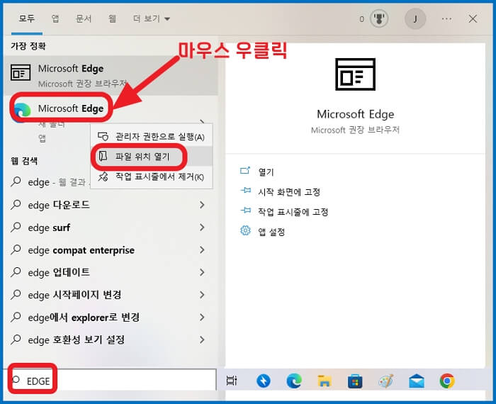 엣지도 똑같은 방식으로 진행합니다. EDGE를 검색하시고 나오는 Microsoft Edge 아이콘을 마우스 우클릭해줍니다. 그리고 파일 위치 열기를 눌러주면 폴더가 열립니다. 엣지 바로가기 아이콘을 찾아줍니다.