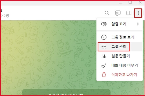 그룹방을 만들었다면 클릭해서 그룹 채팅방에 들어가 줍니다. 그리고 우측 상단에 점 세개 아이콘을 클릭하시고 그룹 관리를 눌러줍니다.