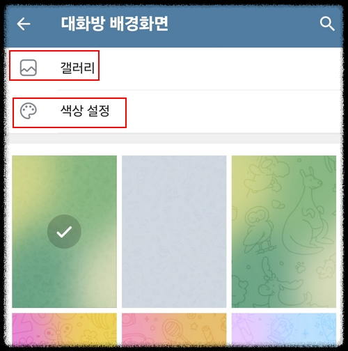 5. 대화방 배경 화면 설정창입니다. 갤러리를 누르면 내 앨범에서 원하는 사진, 이미지를 찾아서 적용시킬 수가 있습니다. 내 가족이나 지인들과 만든 대화방에는 아기자기한 나의 가족 사진을 배경으로 깔아도 좋을 것 같습니다. 색상 설정도 간단하게 하실수가 있으니 꼭 한번 해보시기 바랍니다.