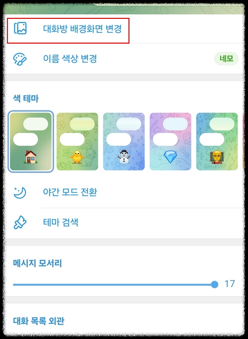 4. 대화방 설정 화면이 나옵니다. 여기에서 대화방 배경화면 변경을 하실수가 있습니다. 색 테마를 고르실 수도 있고, 야간 모드 전환이나 테마 검색을 활용해 보시는것도 도움이 됩니다. 이름 색상 변경도 가능합니다. 우리는 이제 대화방 배경화면 변경 버튼을 눌러봅시다.