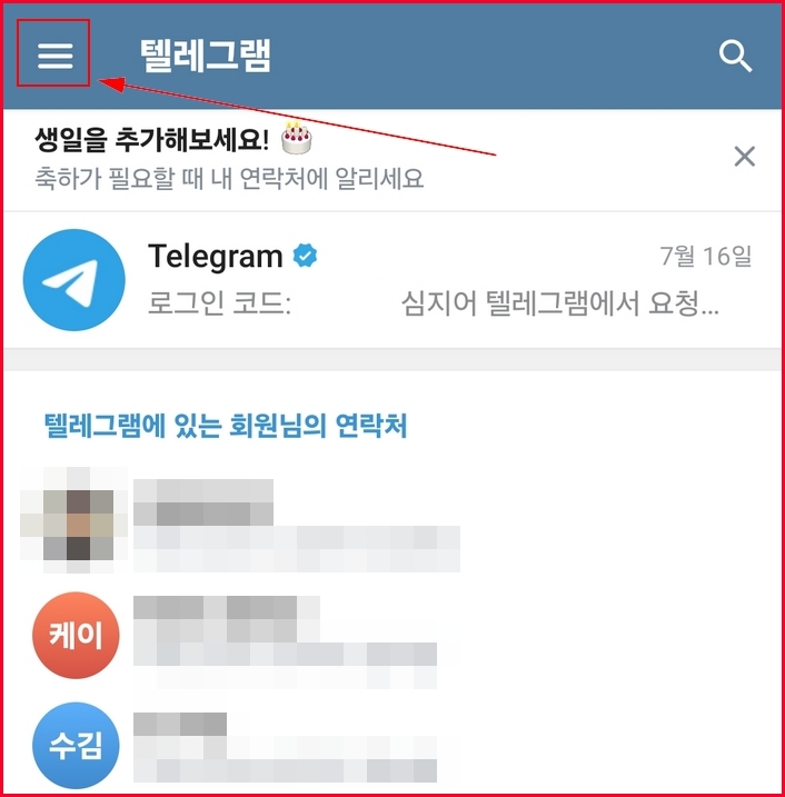 텔레그램에서 단체 대화방 한번에 같이 이용가능한 인원은 200명입니다. 모바일 버전으로 설명을 드립니다. 웹버전이나 데스크탑 버전에서도 비슷하게 가능하니 참고하시기 바랍니다. 좌측 상단의 햄버거 아이콘(목록)을 클릭합니다.