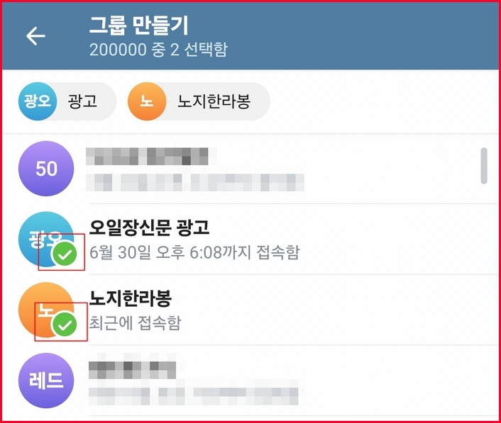 그룹 만들기 화면에서 처음 대화를 시작할 멤버를 클릭해줍니다. 위 이미지처럼 v 녹색표시가 되면 추가가 된 것입니다. 저는 2명만 선택했습니다. 선택이 완료되었다면 다음으로 넘어갑니다.