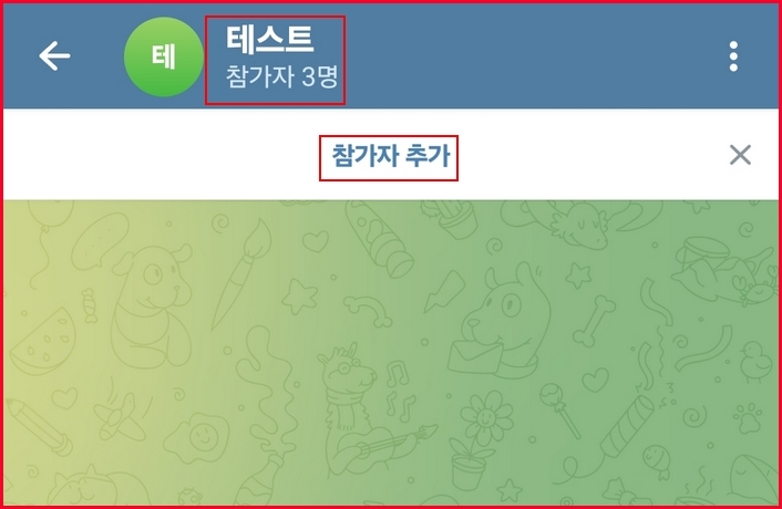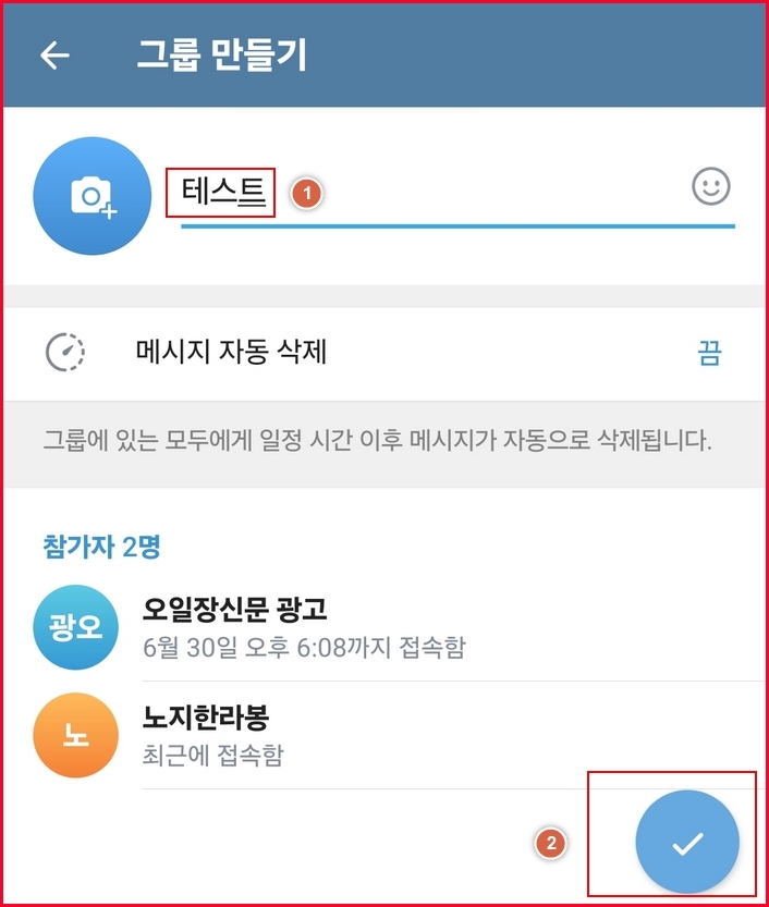텔레그램 그룹방 이름을 만들어줍니다. 저는 테스트라고 입력했습니다. 그리고는 우측 하단의 V표시를 눌러서 확인해줍니다.