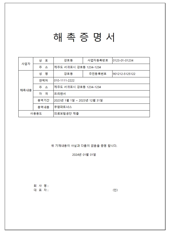 사업자 란에는 계약을 진행했던 사업자의 정보를 입력합니다. 상호와 사업자등록번호, 주소까지 전부 입력합니다. 해촉내용의 내용들은 프리랜서(소득자)의 정보들을 입력하면 됩니다. 주민등록번호는 전부 입력하셔야 합니다. 개인 연락처와 주소를 입력하고 자격란에는 프리랜서 또는 프리랜서 계약직등을 입력하시면 됩니다. 용역 기간은 업무를 하신 기간 또는 계약 기간을 입력하시면 됩니다. 용역내용은 자세하게 자신의 업무내용을 입력하시면 됩니다. 사용용도 역시 공단 제출용등으로 작성합니다. 마지막으로 작성일자와 회사명, 대표자명, 날인을 넣으면 끝입니다.