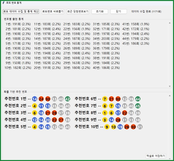 사용 방법입니다. 나는 로또 데이터 수집 필요없이 바로 랜덤 생성된 추천번호를 받고 싶다. 그러신분은 로또번호 바로뽑기 버튼을 누르시면 되고요. 통계를 이용해서 조금이라도 확률을 높이고 싶다 하시면 로또 데이터 수집 및 통계 계산 버튼을 누르시면 됩니다. 결과를 엑셀로 저장하기 버튼을 눌러 저장하실수도 있게 만들어져 있습니다.