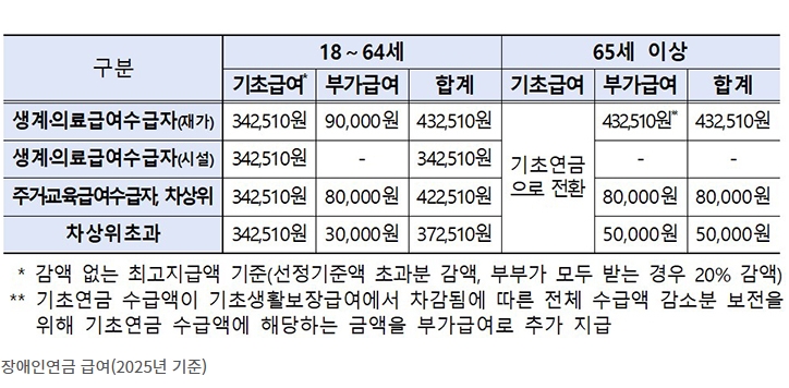 위 표를 보시면 생계의료급여 수급자인 경우 최대 금액인 43만 2510원을 받을 수 있어요. 하지만 65세 이상인 경우에는 기초연금과의 관계 때문에 금액이 달라질 수 있답니다.