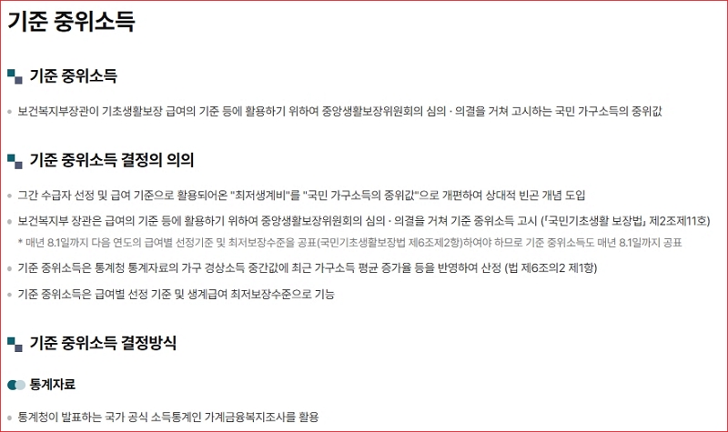 기준 중위소득이란 보건복지부장관이 기초생활보장 급여의 기준 등에 활용하기 위하여 중앙생활보장위원회의 심의, 의결을 거쳐 고시하는 국민 가구소득의 중위값이라고 합니다.
