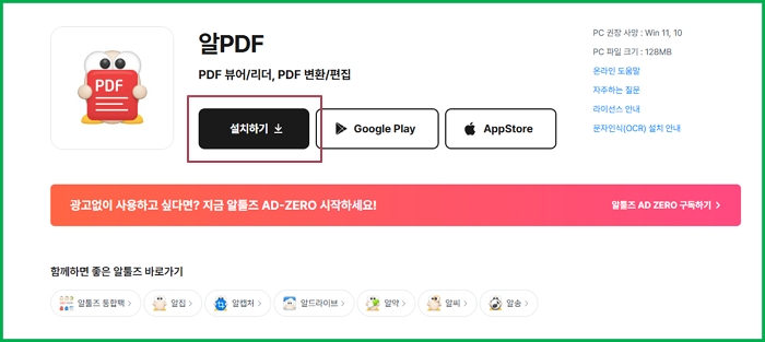 알 PDF 사이트로 접속해 줍니다. 위와 같은 화면이 나옵니다. 설치하기 버튼을 눌러주세요. 모바일 버전은 구글 플레이나 애플스토어에서 설치할 수 있습니다. 설치시 알매니저도 설치가 되는 것 같더라고요. 이경우 설치가 끝나고 다시 삭제를 해주셔도 됩니다. 알매니져 같은 경우에는 말이죠.