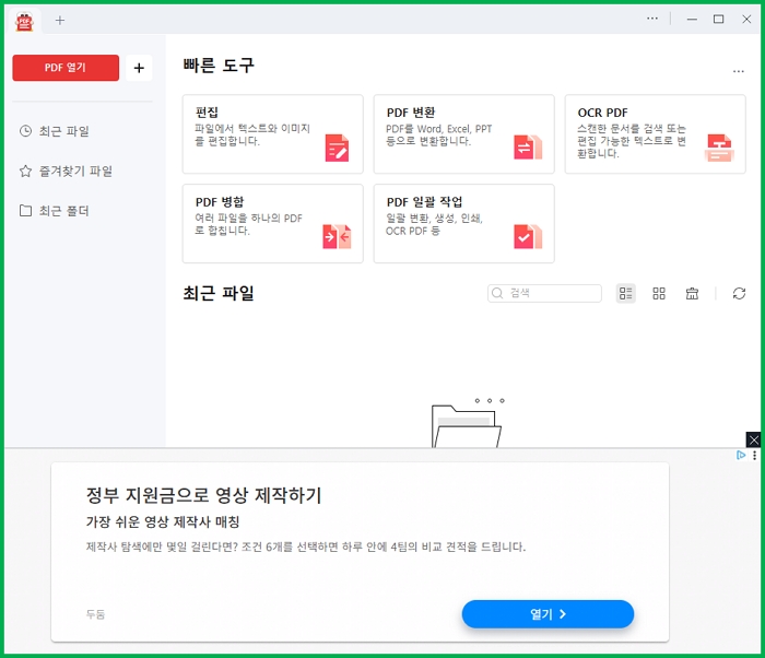 알PDF (RPDF) 실행화면입니다. 편집, PDF 변환, OCRPDF, PDF병합, PDF 일괄 작업이 가능합니다. 다양한 기능들을 가지고 있는 것을 확인하실수가 있습니다.