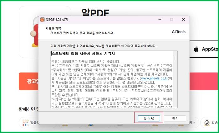 프트웨어 최종 사용자 사용권 계약서가 보입니다. 동의(A) 버튼을 눌러줍니다.