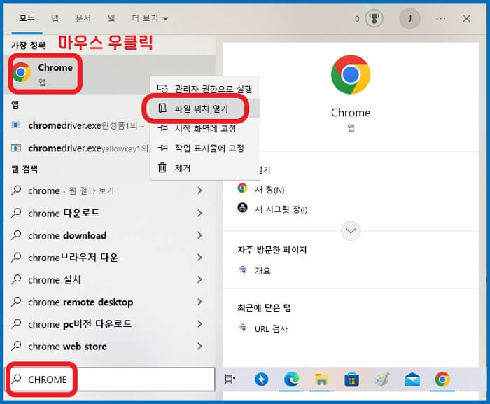 좌측 하단 윈도우 아이콘 우측에 검색란이 있습니다. CHROME을 입력합니다. 그리고 상단에 크롬 아이콘을 마우스 우클릭합니다. 다음으로 파일 위치 열기를 선택해줍니다.